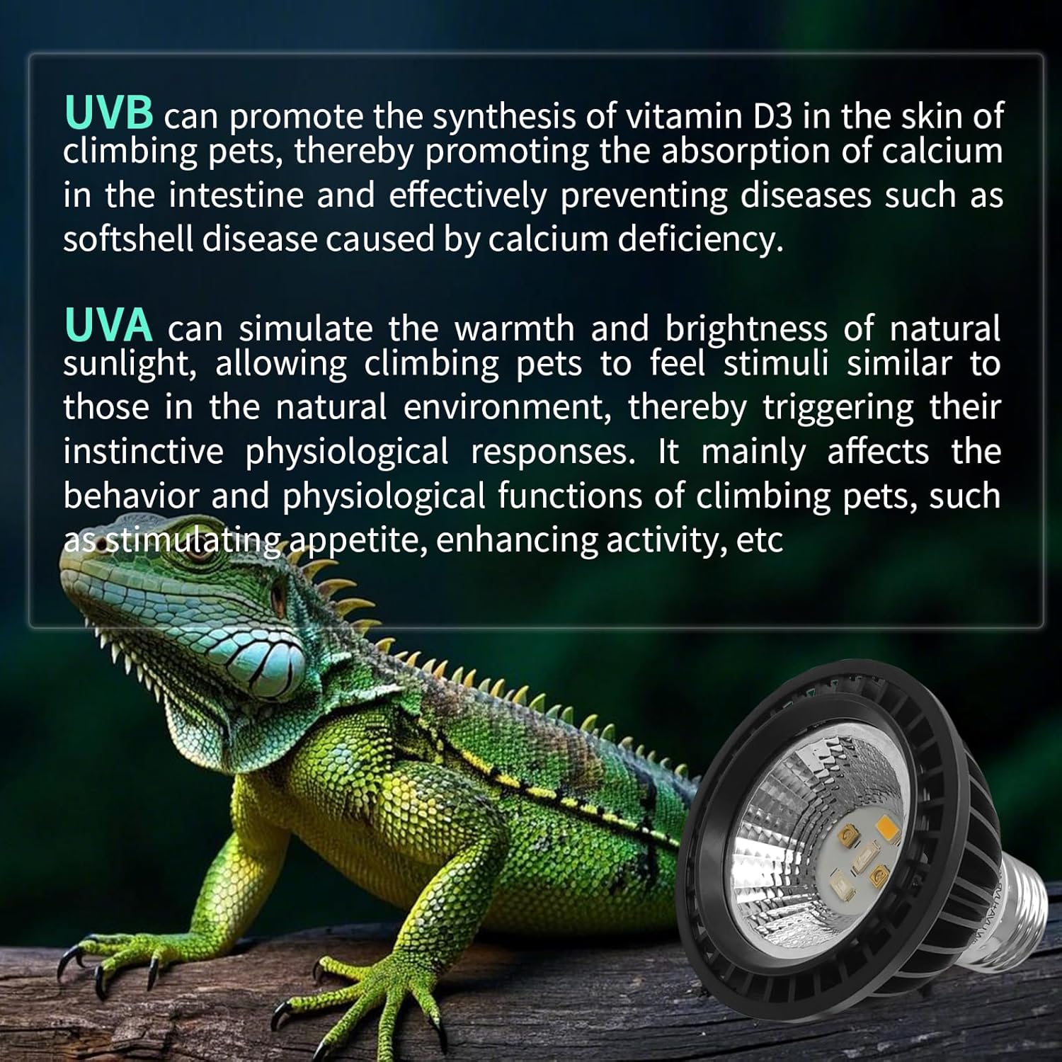 Capable of Stable Use for More Than 8000 Hours: Smaller volume size, LED beads, aluminum alloy lamp body. Efficient electronic components with great heat dissipation and sturdy casing ensure the stability and durability of this reptile UVB bulb. Efficient and stable UVB-UVA light allow reptiles to fully enjoy the sunshine bath.