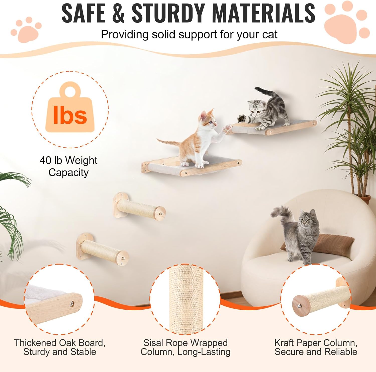 VEVOR Wall Mounted Cat Shelves, Perches with Jumping Posts & Hammocks, Cat Furniture Set up to 40 lbs, Removable & Washable Coral Fleece for Sleeping, Playing, Climbing, Set of 4