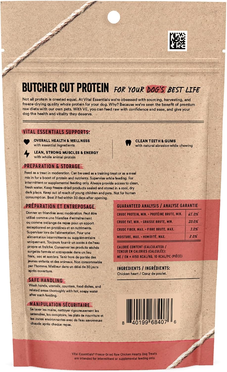 FREEZE-DRIED RAW CHICKEN HEART DOG TREAT: Vital Essentials Freeze Dried Dog Treats pack more protein than industry standard into every bite to deliver the peak vitality your dog deserves. Our natural freeze-dried raw dog treats are made from responsibly sourced, premium butcher cut chicken hearts.