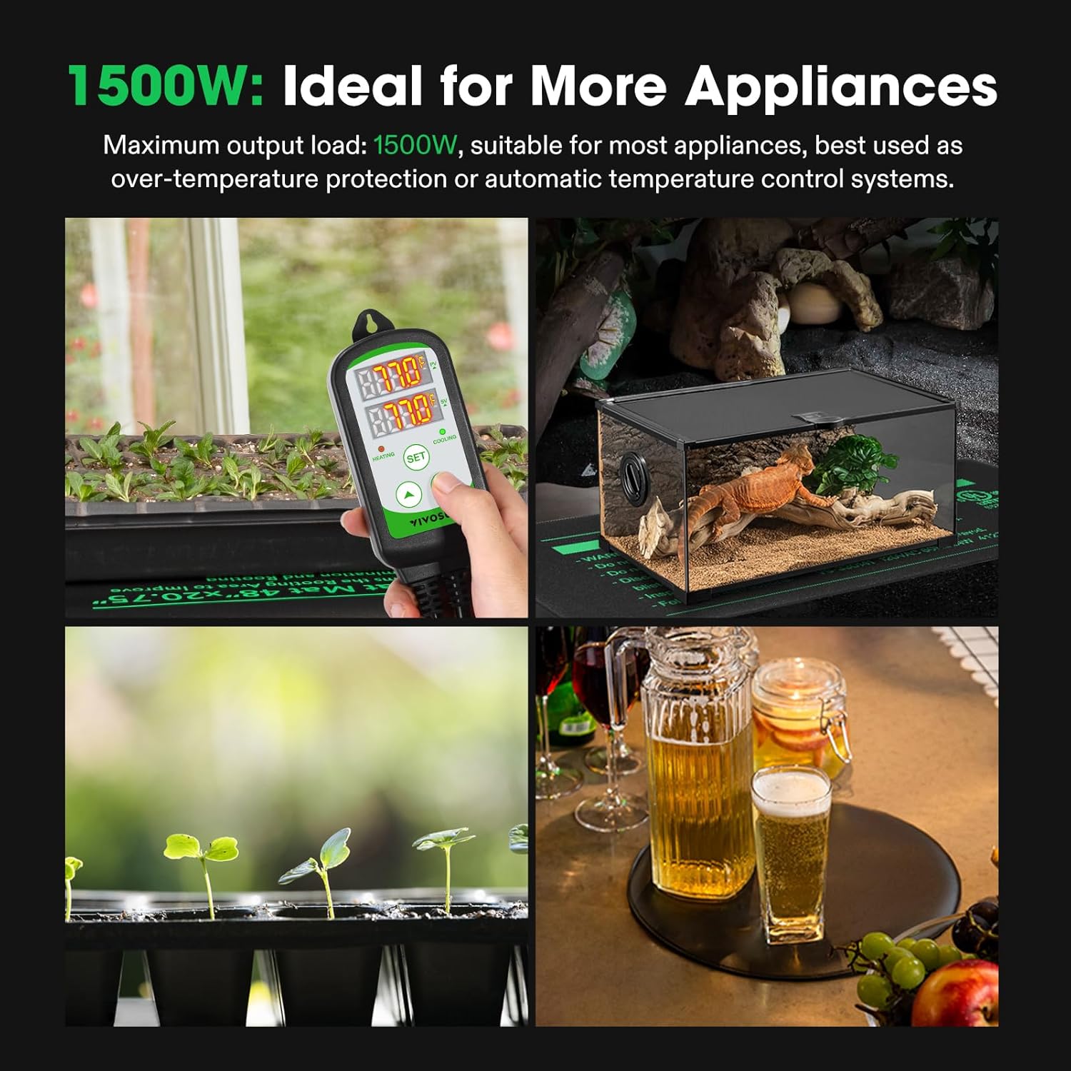 Numerous Applications: With a large output power of 1500W, this product is suitable for most appliances; Best used as over-temperature protection or automatic temperature control systems for home-brewing equipment, aquariums, incubators, heat mats, reptile terrarium, greenhouse, AC units, chest freezers, radiators, etc.
