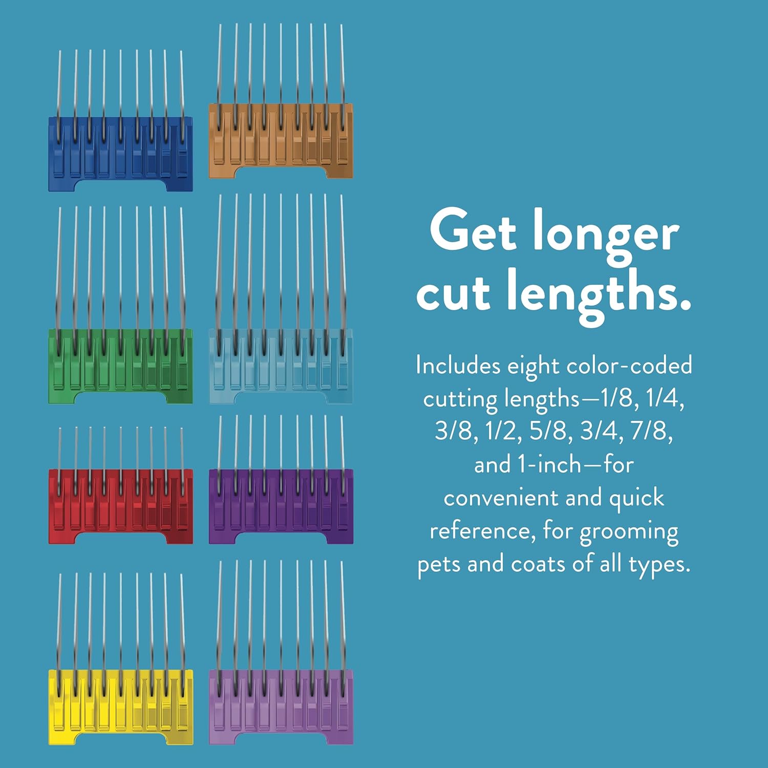 Includes eight color-coded cutting lengths–1/8, 1/4, 3/8, 1/2, 5/8, 3/4, 7/8, and 1-inch–for convenient and quick reference while clipping and grooming dogs, cats, horses, and other animals