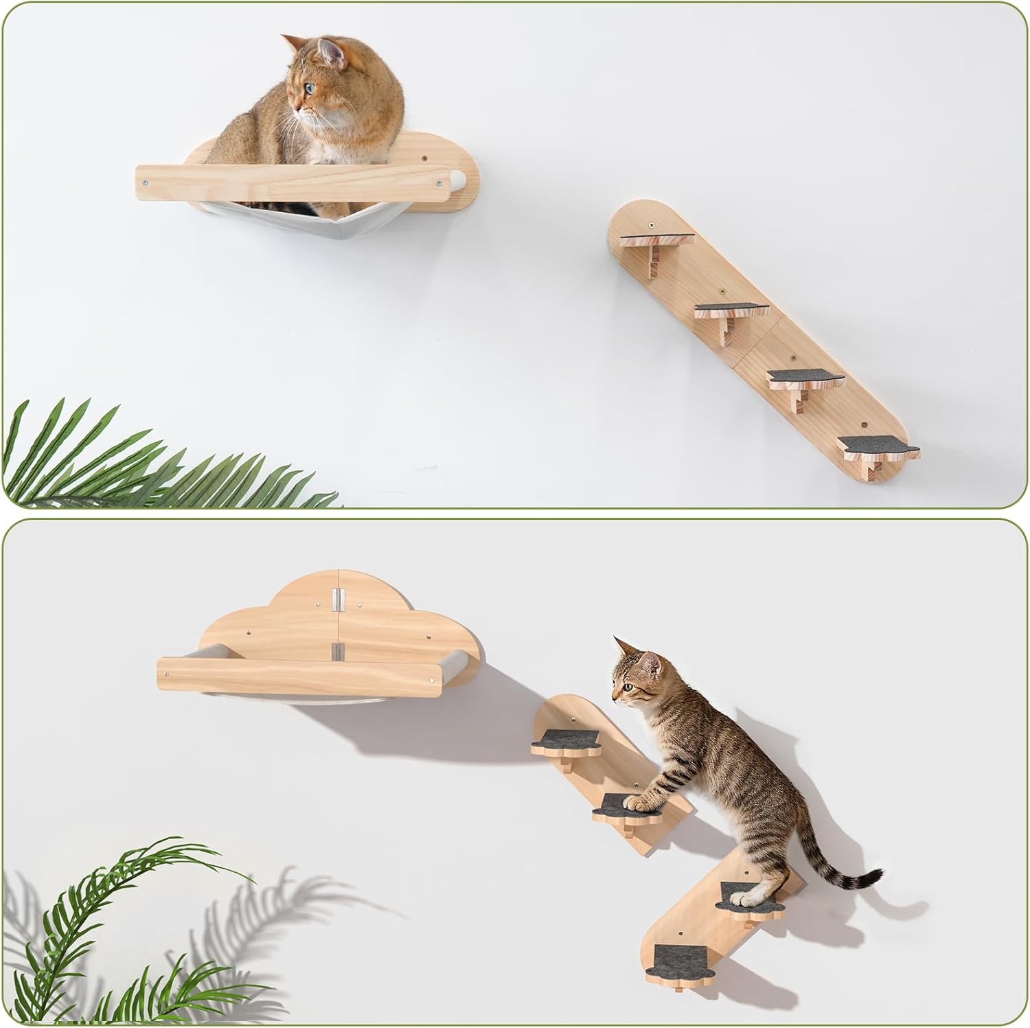 Staylish Cat Perches & 4-step Vertical Exploration:Featuring a comfortable wall-mounted cat hammock and four wooden wall-mounted cat shelf steps, this wall-hung cat furniture not only provides ample space for your cat to stretch out, curl up, and nap, but also offers the elevated perches they crave—allowing them to climb and play. It effortlessly creates valuable vertical space, satisfying your cat’s natural instincts.