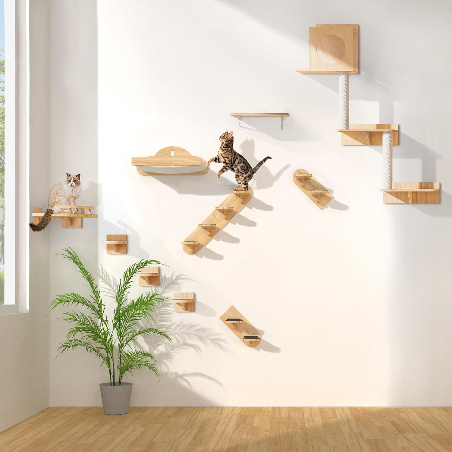 Up to 30lbs: Crafted from solid pine wood, this cat hammock boasts a weight capacity of 30 pounds—more than enough to support your energetic fur baby’s daily activities. It prevents wobbling and tipping, ensuring long-term safe use. We believe this cat wall hammock gives cats a safe, comfortable space for your feline to climb, lounge, and enjoy their territory.