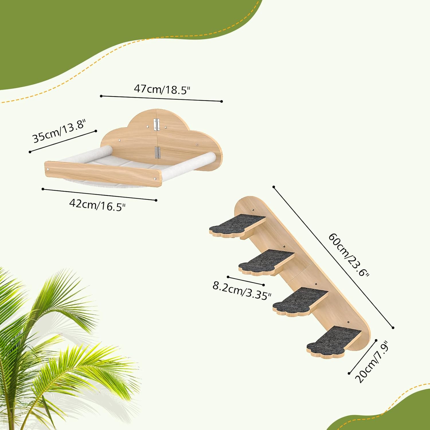 Roomy Sky-Hideaway:The cat hammock measures 16.9×13.7 inches, and the four-step cat staircase has a total length of 23.6 inches with each step 3.35 inches wide—perfect for small and medium-sized cats. It provides ample, spacious room to meet their needs for resting, playing, jumping, and climbing: your cat can stretch its limbs freely to relax,jump, and stay active。 We’re sure your cat will soon fall in love with their new wall-mounted cat furniture!