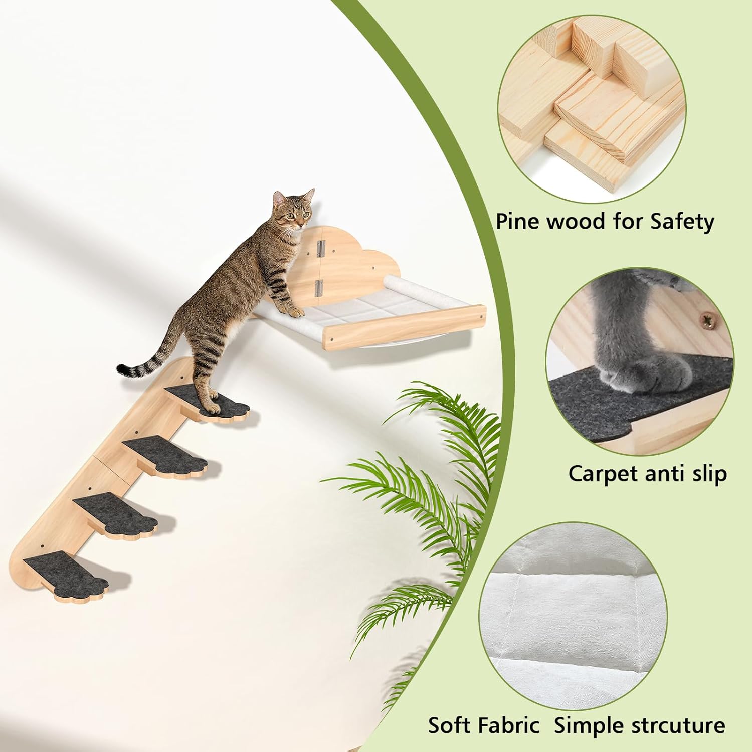 Comfortable & Safe Access:The cat hammock features a sturdy frame crafted from solid pine wood, paired with a soft yet durable polyester-cotton blend fabric—offering both comfortable touch and reliable support. The steps of the accompanying cat staircase are not only spacious but also come with a built-in anti-slip design, allowing your cat’s paws to fit firmly against the surface, making climbing a safer and more secure