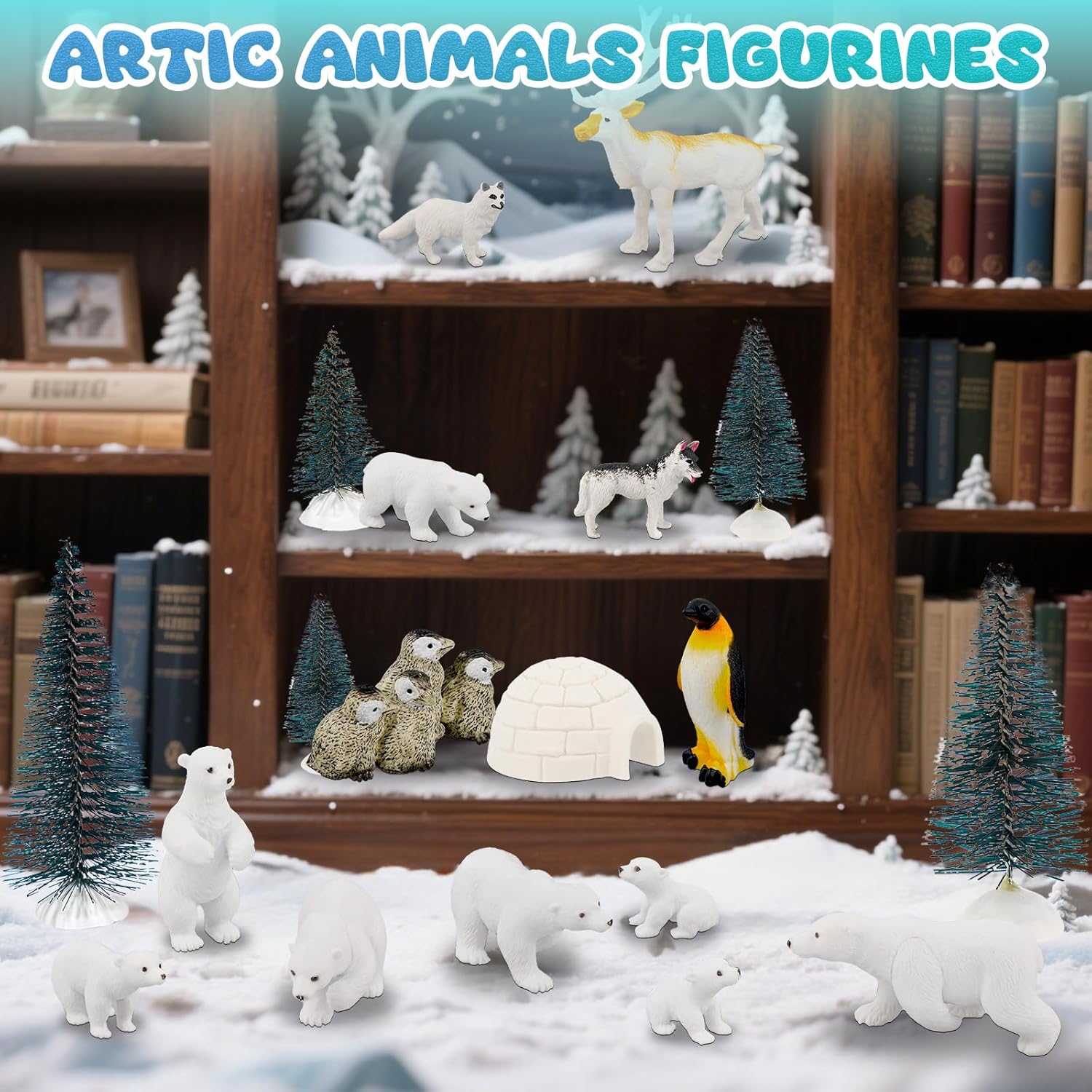 Warmtree 46 Pcs Arctic Animals Figurines Set Includes 22 Polar Bear Penguin Animals Figurines 6 Mini Pine Trees 18 Artificial Lceberg Fake Snow Ripple Water Sticker Ocean Habitat Diorama Supplies