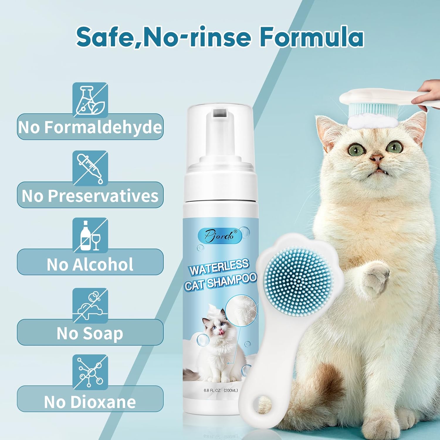 Waterless Cat Shampoo with Brush and Cloth, 6.8 FL OZ Cat Shampoo and Conditioner, Cat Dry Shampoo, No Rinse Formula for Quick Clean, Care for Cats and Kittens with Itching & Sensitive Skin