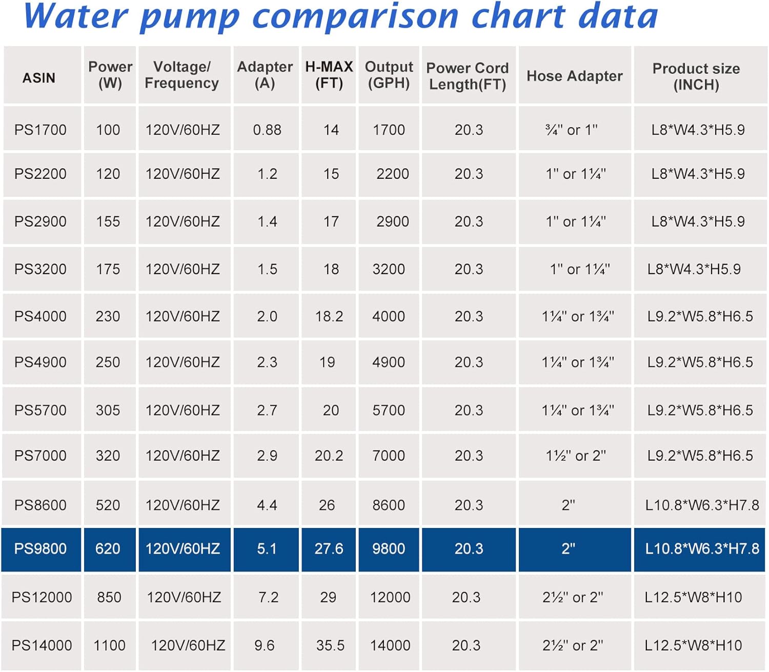 I use the WaterRebirth PS-2900 (2900 GPH, 155W, UL listed) to supply water through two filter stages and into a 50-gallon duck pond. This pump has been a huge improvement over the expensive aquaponics pump I owned before, which constantly clogged and struggled to prime.The PS-2900 primes easily, delivers excellent flow, and handles duck waste without trouble. I run it as a submersible, but it can also be used inline by removing the front grill. The outflow port angle is technically adjustable, though not very intuitiveâI left mine pointing straight up as it came from the box.Overall, this is a strong, reliable pump. For small ponds, itâs about as good as you can get.