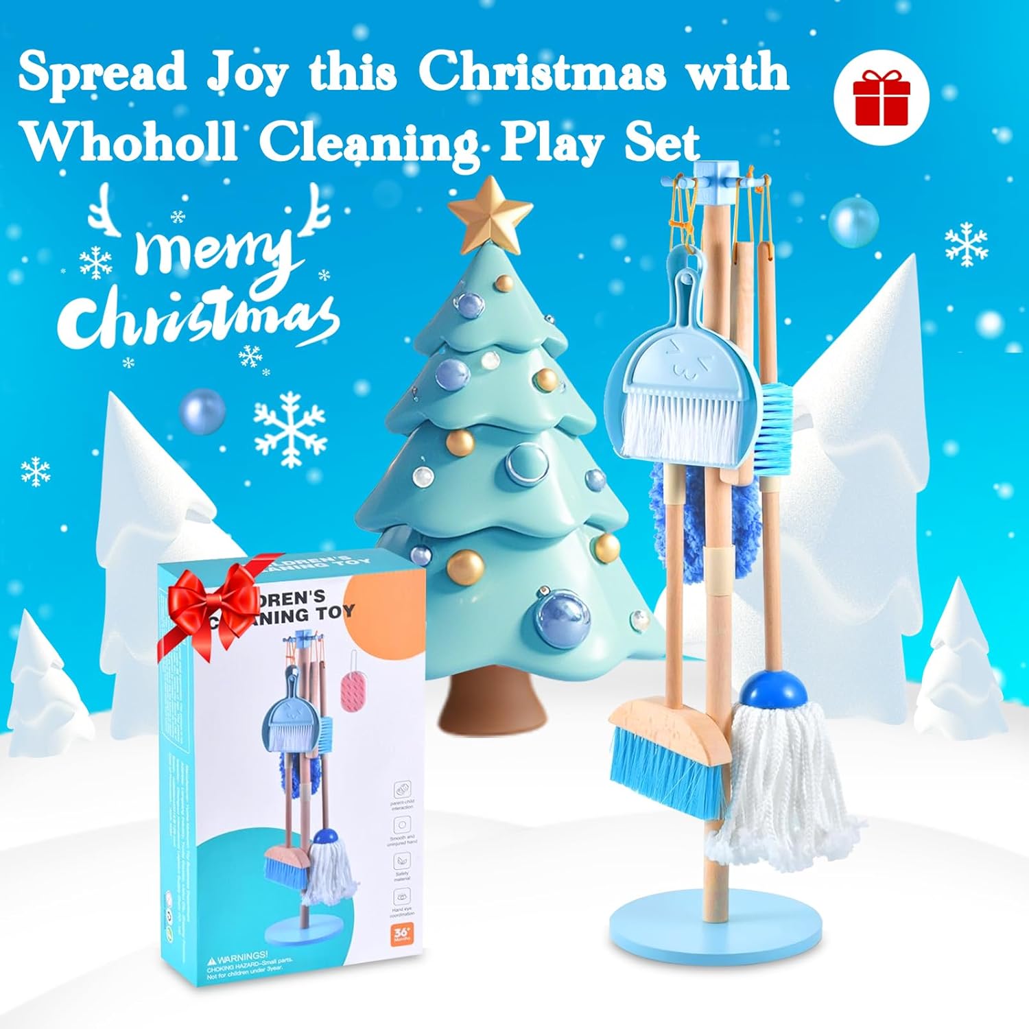 WHOHOLL Wooden Kids Cleaning Toy Set, Montessori Toys for Toddlers 3-5, Housekeeping Play Set Includes Broom Mop Duster Dustpan Sponge and Organizing Stand, Christmas Birthday Gifts for Boys Girls