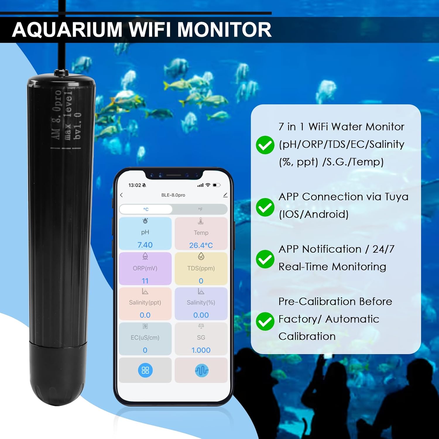WiFi Water Quality Tester 7-in-1 Smart Water Quality Monitor Probe Monitor pH/ORP/TDS/EC/Salinity/SG/Temp for Aquarium, Fish Tank, Hydroponics, Aquaculture, Real-Time Data Monitoring via App