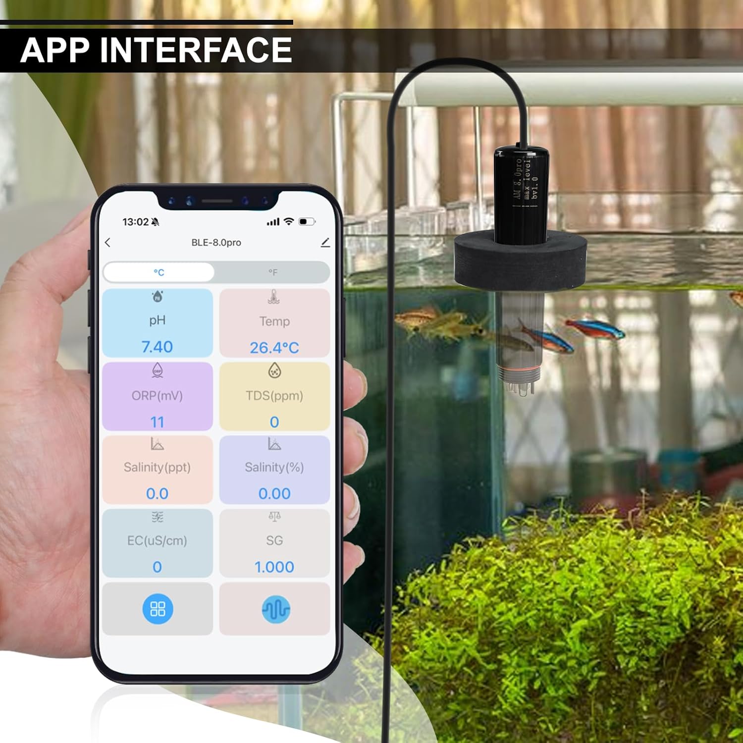 ✅【7-in-1 Real-Time Water Monitoring】Ensure a perfect environment for your aquatic life and plants. Simultaneously tracks 7 critical parameters: pH, Temperature, TDS, EC, Salinity, Specific Gravity (S.G), and ORP. Real-time data to prevent problems before they start and maintain optimal water health 24/7.