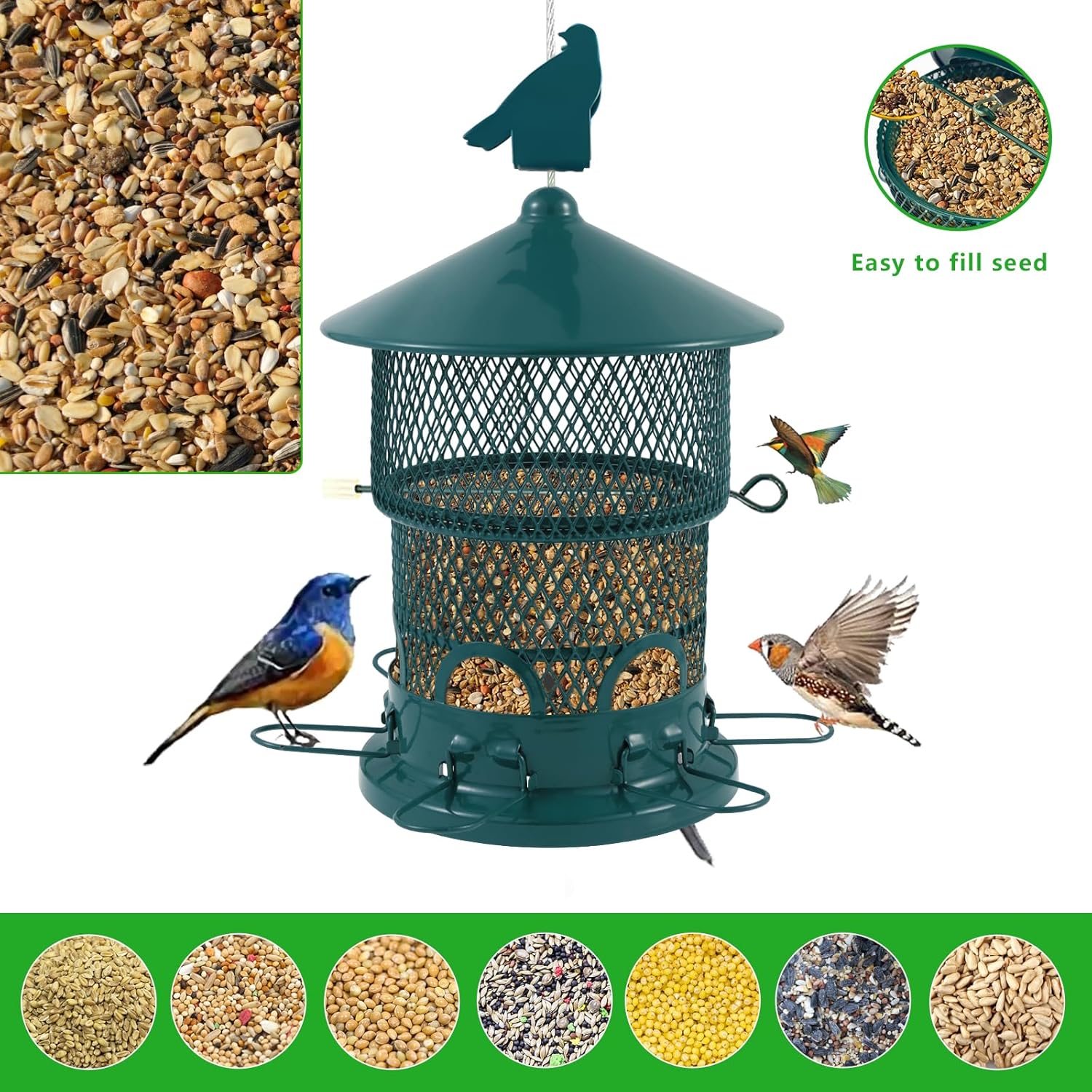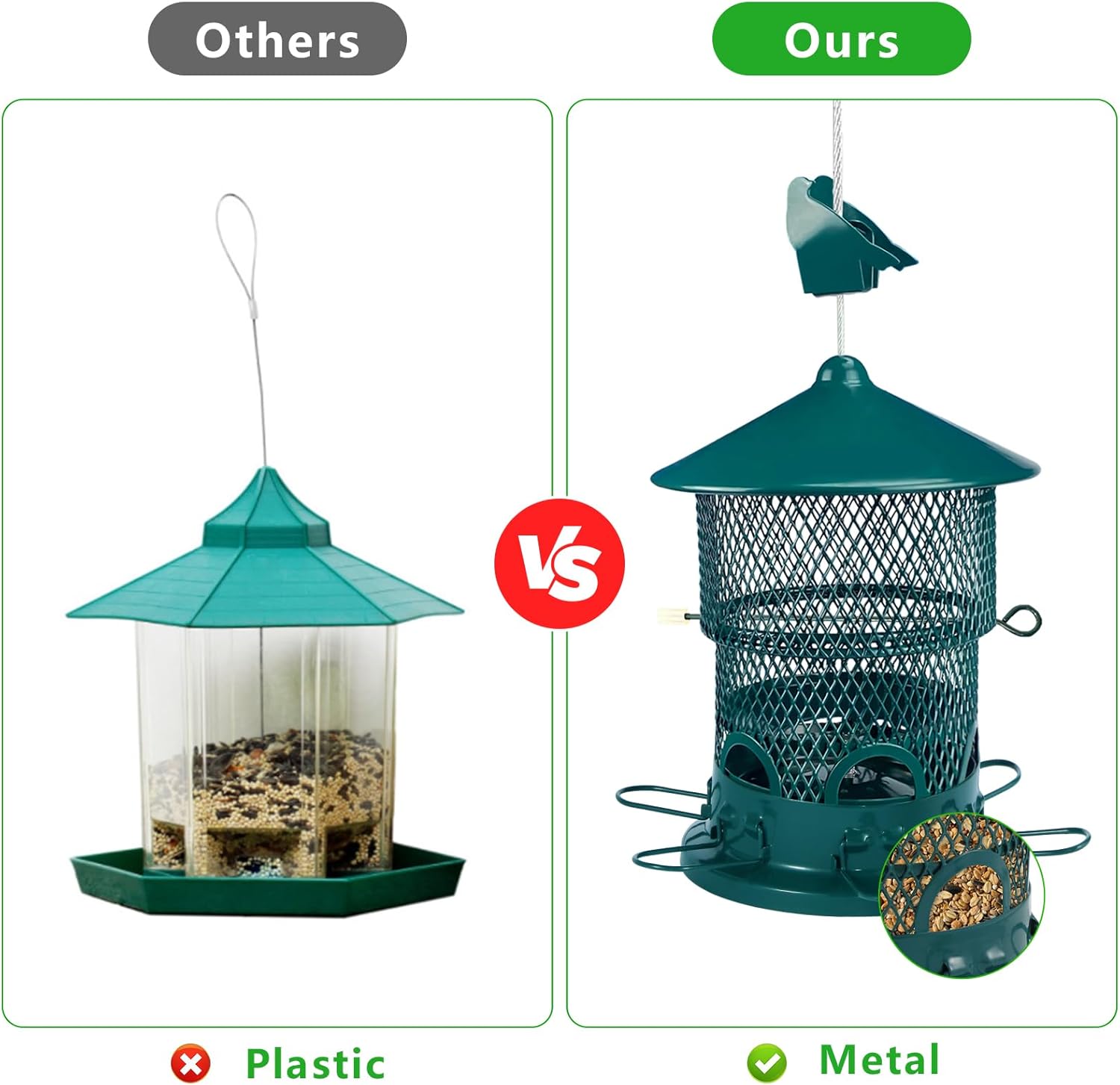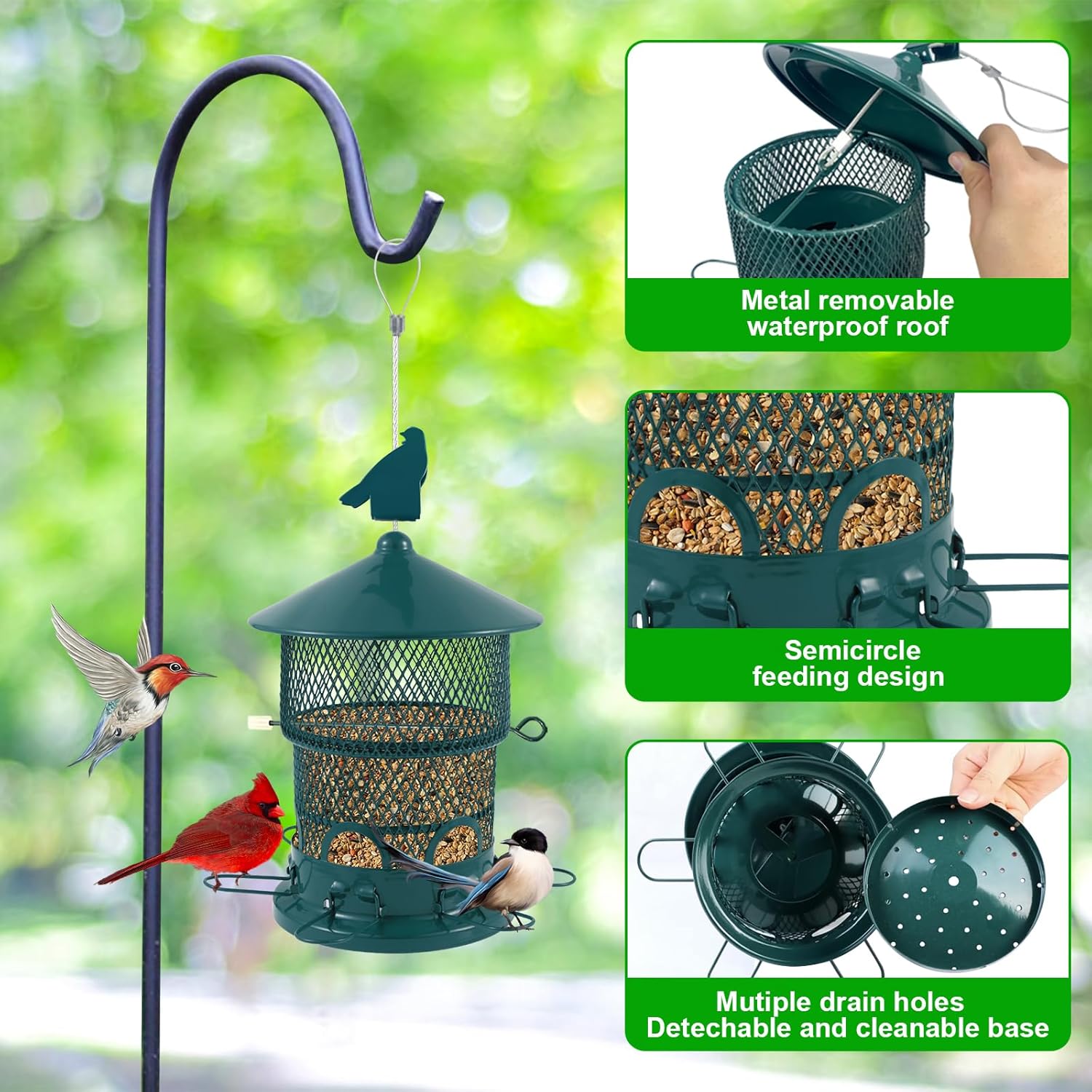 【Durable & Weatherproof Metal Build】 Crafted from heavy-duty, rust- and chew-resistant metal, this bird feeder is built to withstand outdoor conditions like rain, snow, and sun—ideal for long-term, year-round use.