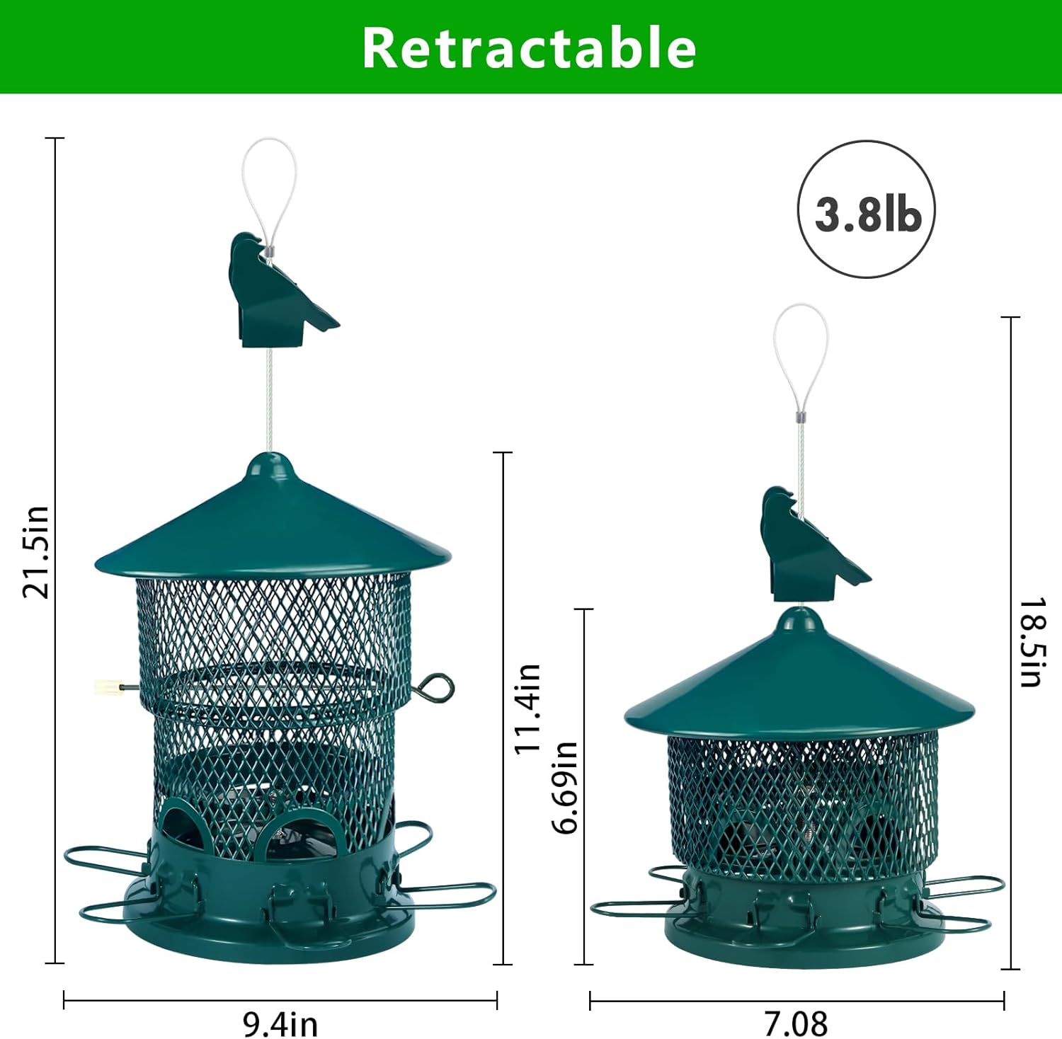 Wild Bird Feeder for Outdoors Hanging, Retractable Metal Bird Feeders, 3.8LB Large Capacity Feeders for Cardinal, Blue Jay, Finch, Backyard Wildlife Bird Watching (Green)