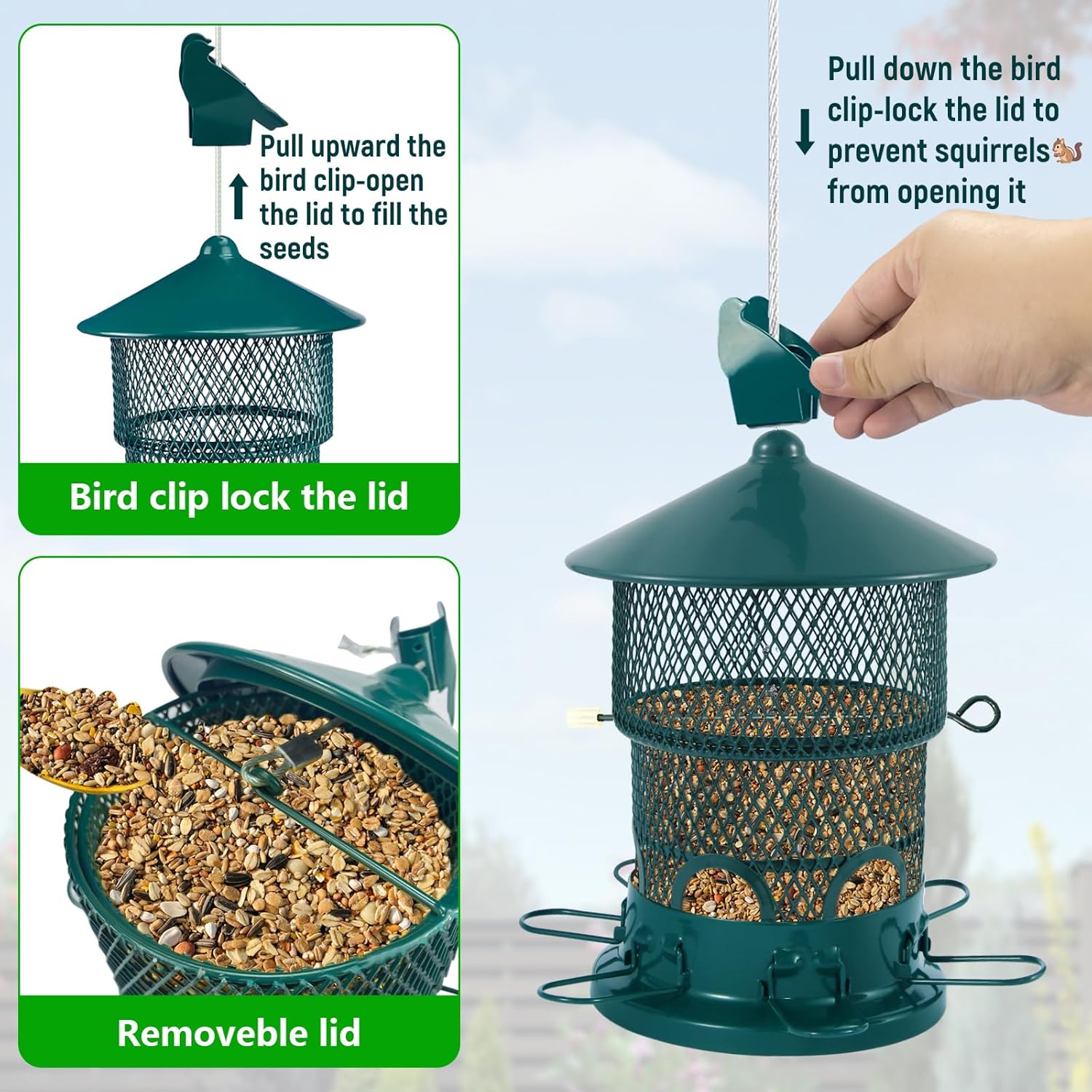 【Secure Lock Lid with Bird-Shaped Clip】 A charming bird-shaped clip keeps the lid firmly closed to help deter squirrels and prevent seed spills, while still allowing quick access for refills.