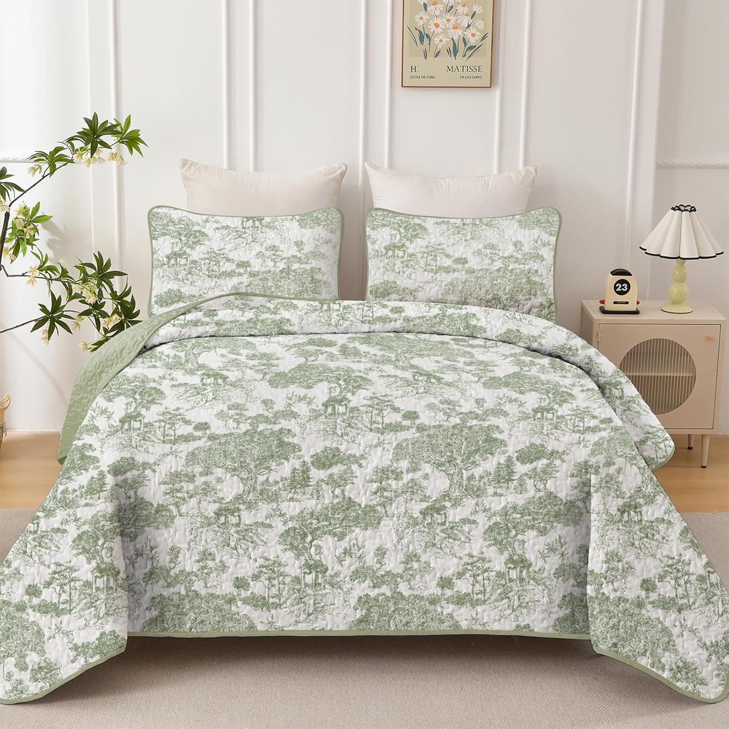 3 Pieces Quilt Set:Botanical printed toile quilt set queen size include 1 quilt (96″x 90″) + 2 pillow shams (20″x 28″).The reversible lightweight sage green quilt can mix up the style as the seasons change from summer to winter.