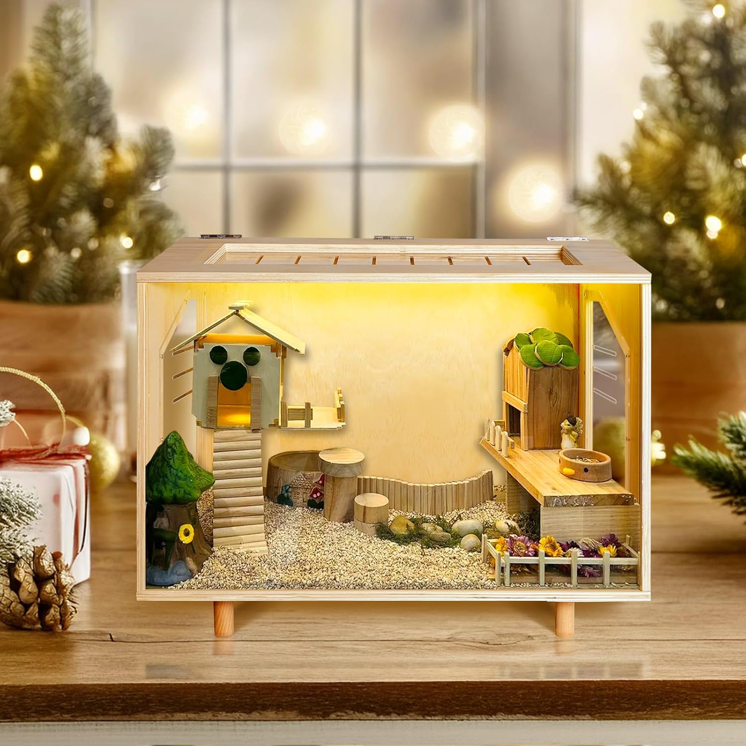 【HIGH QUALITY MATERIAL】: The bottom and pillars are made of high-quality wood panels, sturdy and reliable structure to ensure the safety and stability of your hamster. Equipped with high-quality acrylic panels around the perimeter to provide a clear view, allowing you to observe the hamster’s activities at any time, and the hollowed-out design ensures ventilation and transparency.
