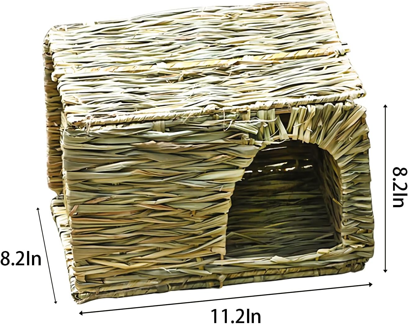 11.2”(L)*8.2”(W)*8.2”(H), fit for most of small animals, such as small rabbit, guinea pig, chinchilla, hamster, ferret and other small animals. Package includes 2 pack grass house.