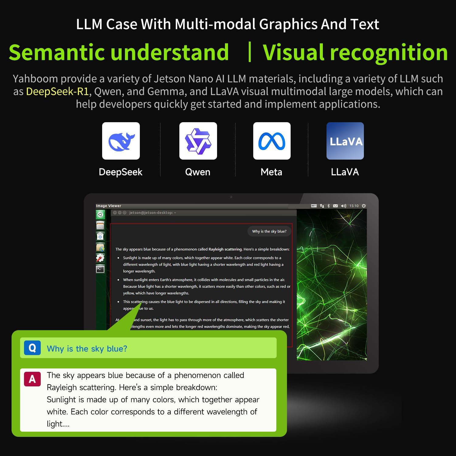 【Empowered by Large Al Model, Enhanced Human-Computer Interaction】Jetson Orin Super leverages three AI models and incorporates an AI voice interaction module. This multimodal visual system matches the scene being described, enabling environmental awareness and AI visual gameplay. Combined with a large-scale voice module and camera, it enables speech-to-text, semantic analysis, natural conversation, and real-time video analysis, enabling advanced embodied AI applications.