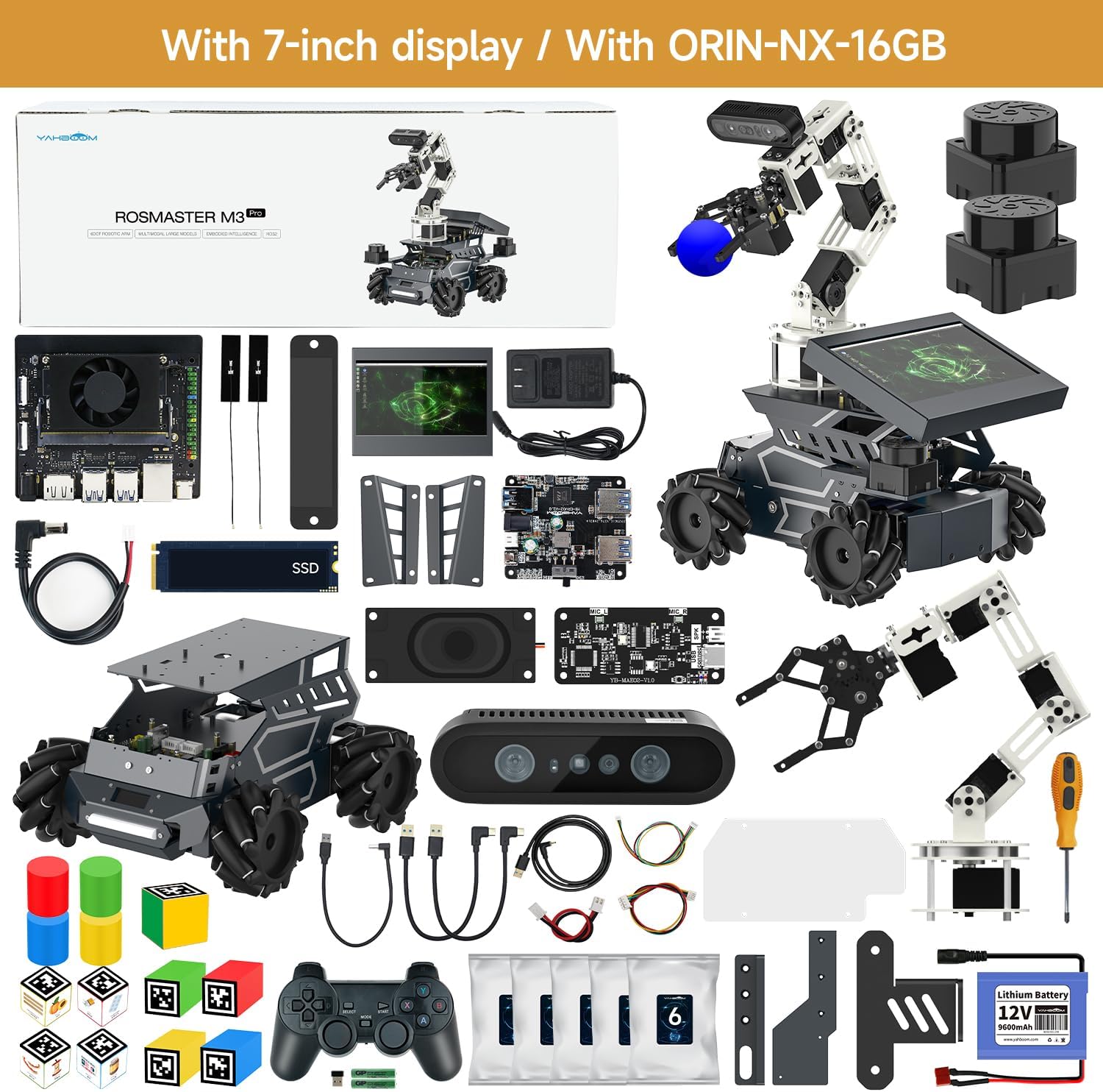 Yahboom ROS2 Robot Kit with Jetson Orin NX 16GB Super Large AI Model with 6DOF Robotic Arm,7-inch HD Display,AI Voice Interaction Module Provides AI Vision、App Control
