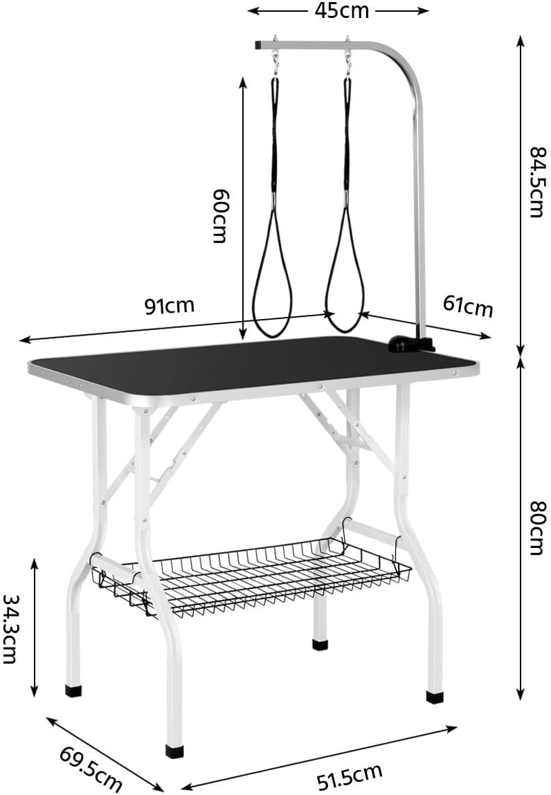 Foldable Design for Easy Carry: This portable pet salon table has goal-post-style legs that can be folded up in the center. The piece weighs only 13.4kg/29.5lb and is very suitable for distance transportation. An attached strap at the bottom of the table also ensures effortless portability