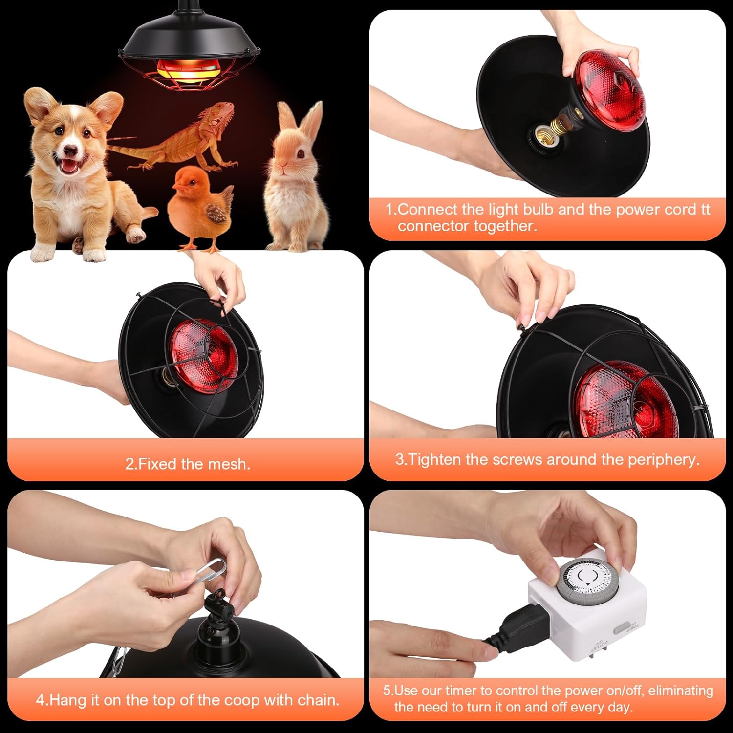 🐣A 2-meter-long Chain: Our heater kit also comes with a two-meter-long chain, which helps you suspend it above the livestock, simplifying your installation process. (The package contains: heater*1, 2-meter chain*1, daily On/Off cycle timer*1.)