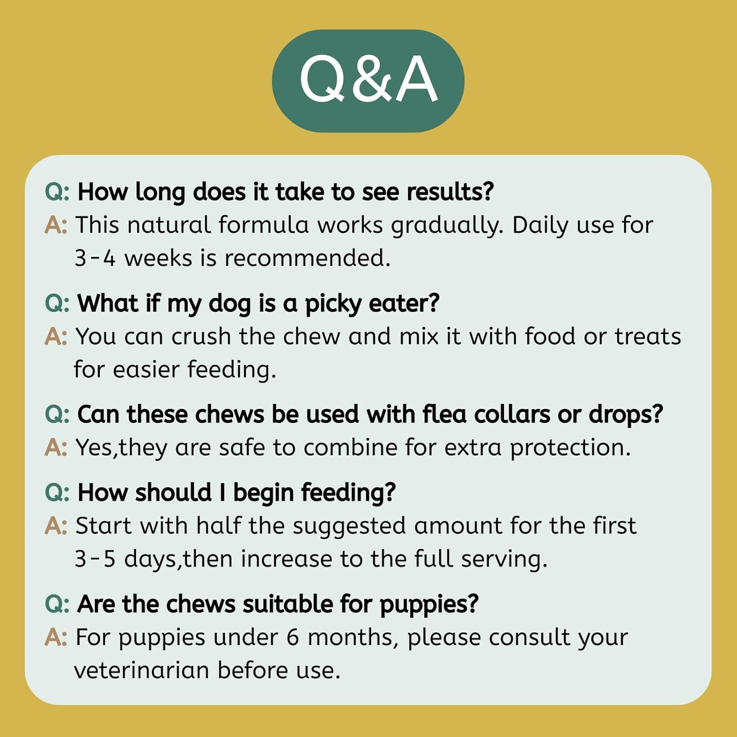 Natural supplement that works gradually with daily use (3-4 weeks), easy to give by crushing and mixing with food,start with half serving for 3-5 days,then increase to full, safe for daily use,and can be combined with flea collars or drops (consult vet for puppies under 6 months).
