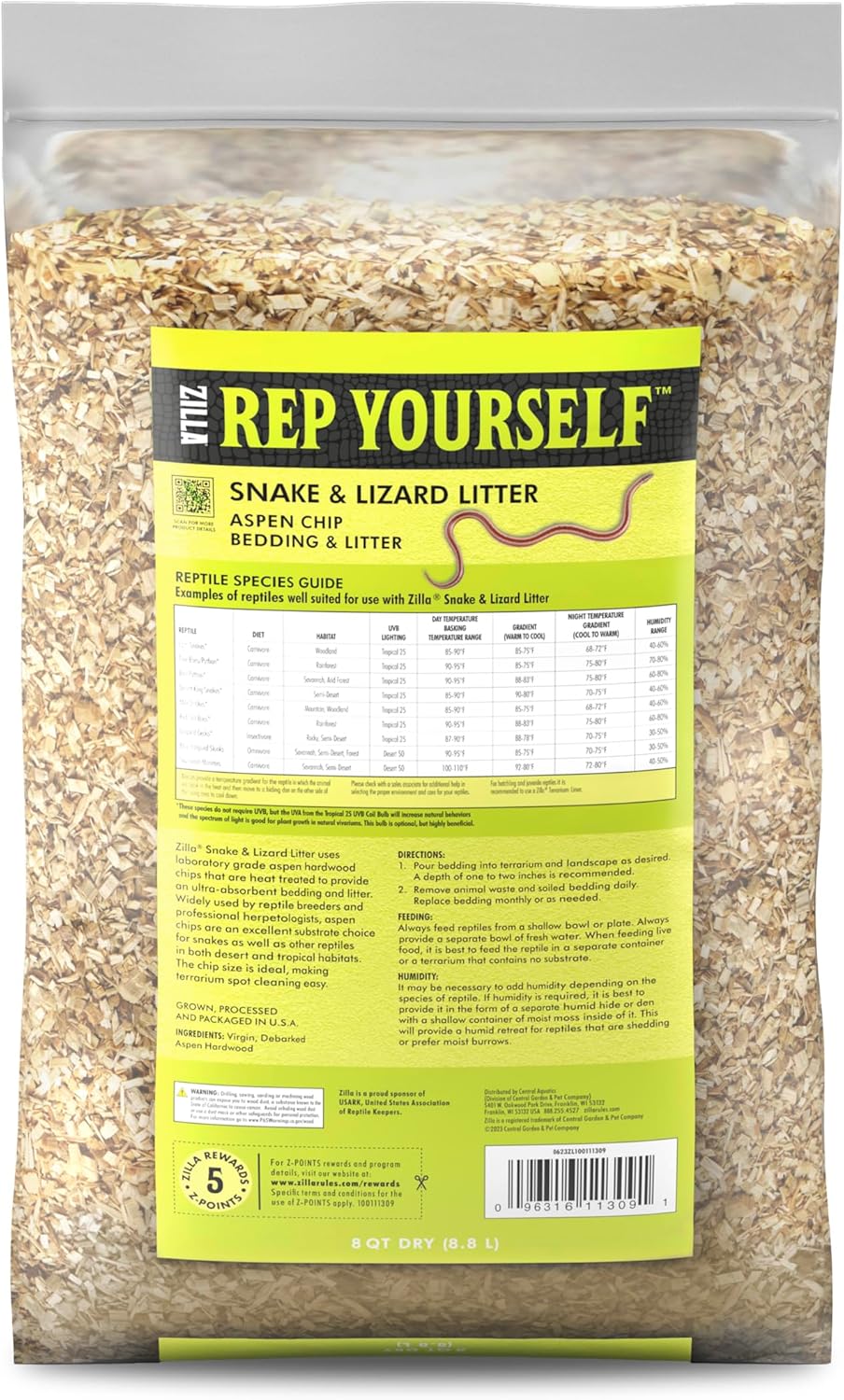 Treat your snake or lizard to a comfortable and absorbent bedding choice they’ll love. Zilla Snake & Lizard Litter is a high-quality substrate designed specifically with the needs of snakes and lizards in mind. Made with heat-treated aspen chips, this is an ultra-absorbent bedding option that provides your reptile with a comfortable environment they’re happy to burrow into. The aspen chips are 100% natural and hypo-allergenic, containing no harmful aromatic oils. Cleaning is made simple thanks to the size of the chips, as it’s easy to spot the mess and quickly replace any chips that are dirty. This bedding option is ideally suited for snakes, monitors, skinks and geckos. Provide a high-quality home for your reptile that’s safe, comfortable and healthy. Celebrate your pet and Rep Yourself, with Zilla.