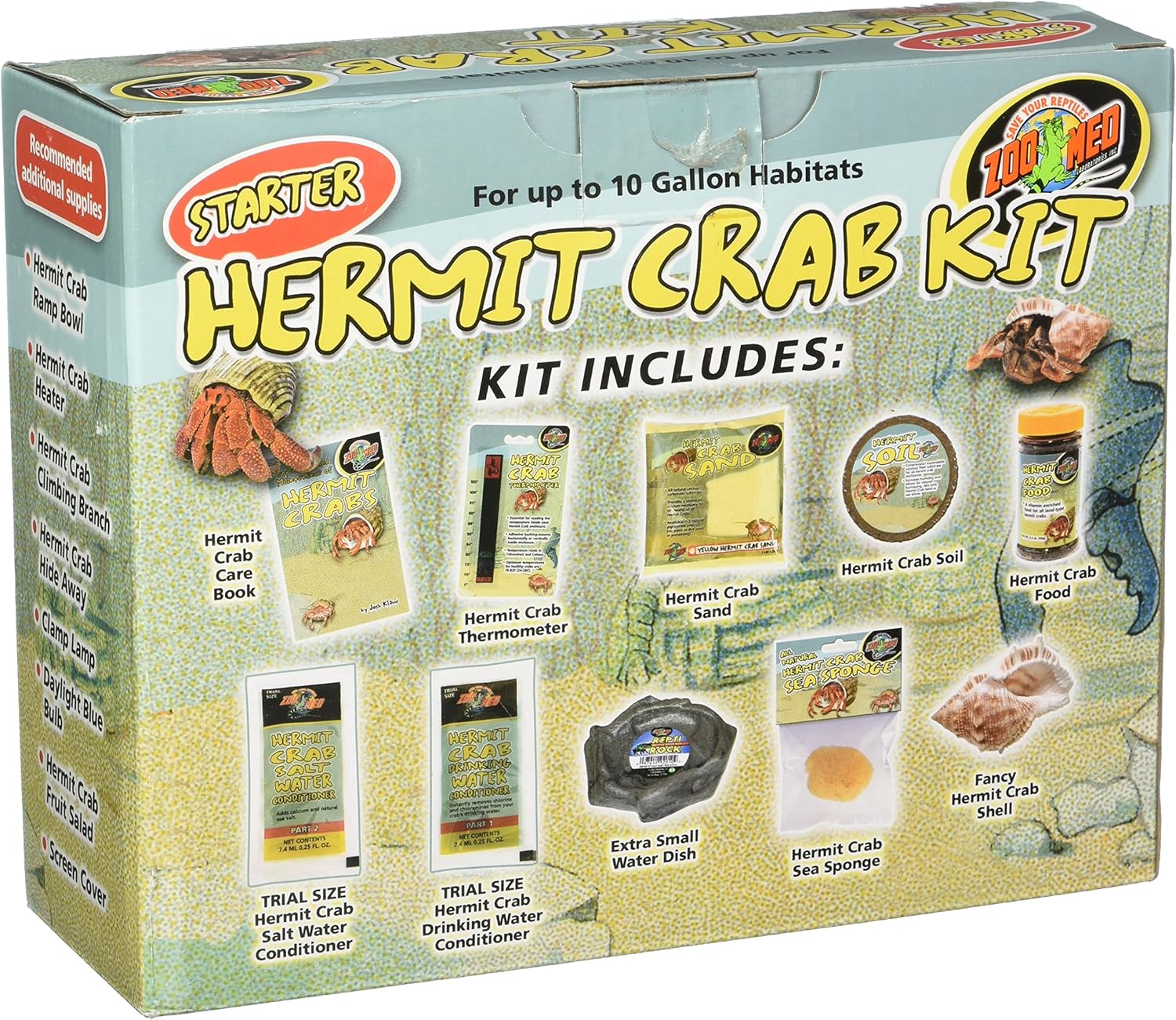 A great starter kit for Hermit Crabs. The Hermit Crab Kit includes: Hermit Crab Care Book, Hermit Crab Thermometer, Hermit Crab Sand, Hermit Crab Soil, Hermit Crab Food, Trial Size Salt Water Conditioner, Trial Size Drinking Water Conditioner, Extra Small Water Dish, Hermit Crab Sea Sponge, Fancy Hermit Crab Shell.