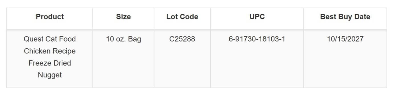 Cat parents are being urged to check their homes after Go Raw, LLC announced a voluntary recall of a single lot of Quest Cat Food — Chicken Recipe Freeze-Dried Nuggets due to potentially low levels of thiamine (Vitamin B1).
