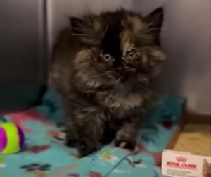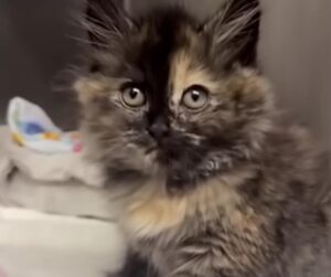 Despite her unusual condition, Zoe still had the gentle curiosity of a kitten. She looked up at the shelter staff with wide eyes, quietly waiting for someone to help.