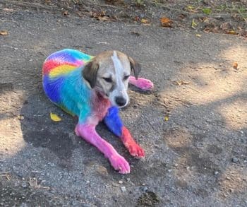 She approached slowly, trembling. Her white and brown coat was no longer recognizable. Bright, unnatural colors covered her body from head to tail. The paint clung stiffly to her fur, turning it hard and sticky.