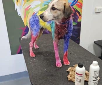 Chantal received a careful bath, though much of the paint refused to come off. Even after scrubbing, bright stains remained embedded in her coat. To help her heal, the team gave her a haircut, removing as much of the contaminated fur as possible.